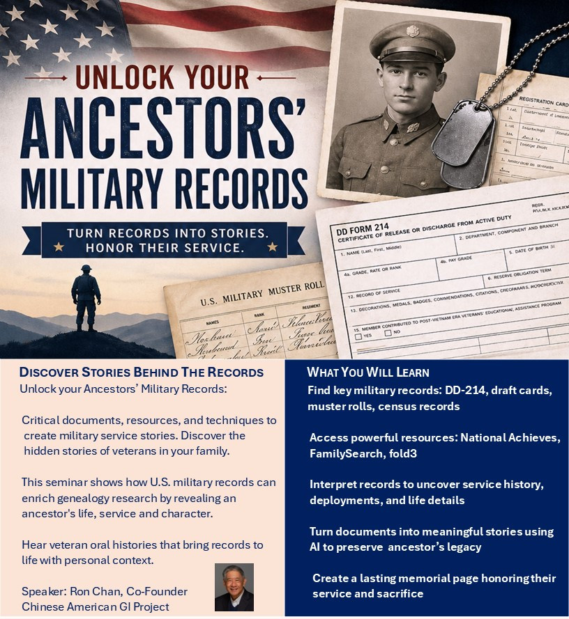 Ron is a seasoned lecturer on family history documentation best practices, captivating audiences worldwide at genealogy workshops and libraries across the San Francisco Bay Area. As a published genealogy author, he has a passion for storytelling and teaches innovative technologies to bring ancestral tales to life. Ron is the Founder and Executive Director of the Bay Area Chinese Genealogy Group, dedicated to preserving ancestral stories. He is also a co-founder of the Chinese American GI Project, ensuring that veterans’ legacies are not lost, forgotten, or ignored. Ron shares with you how to capture and share family struggles of the past so future generations can embrace, remember, and learn from those who came before.